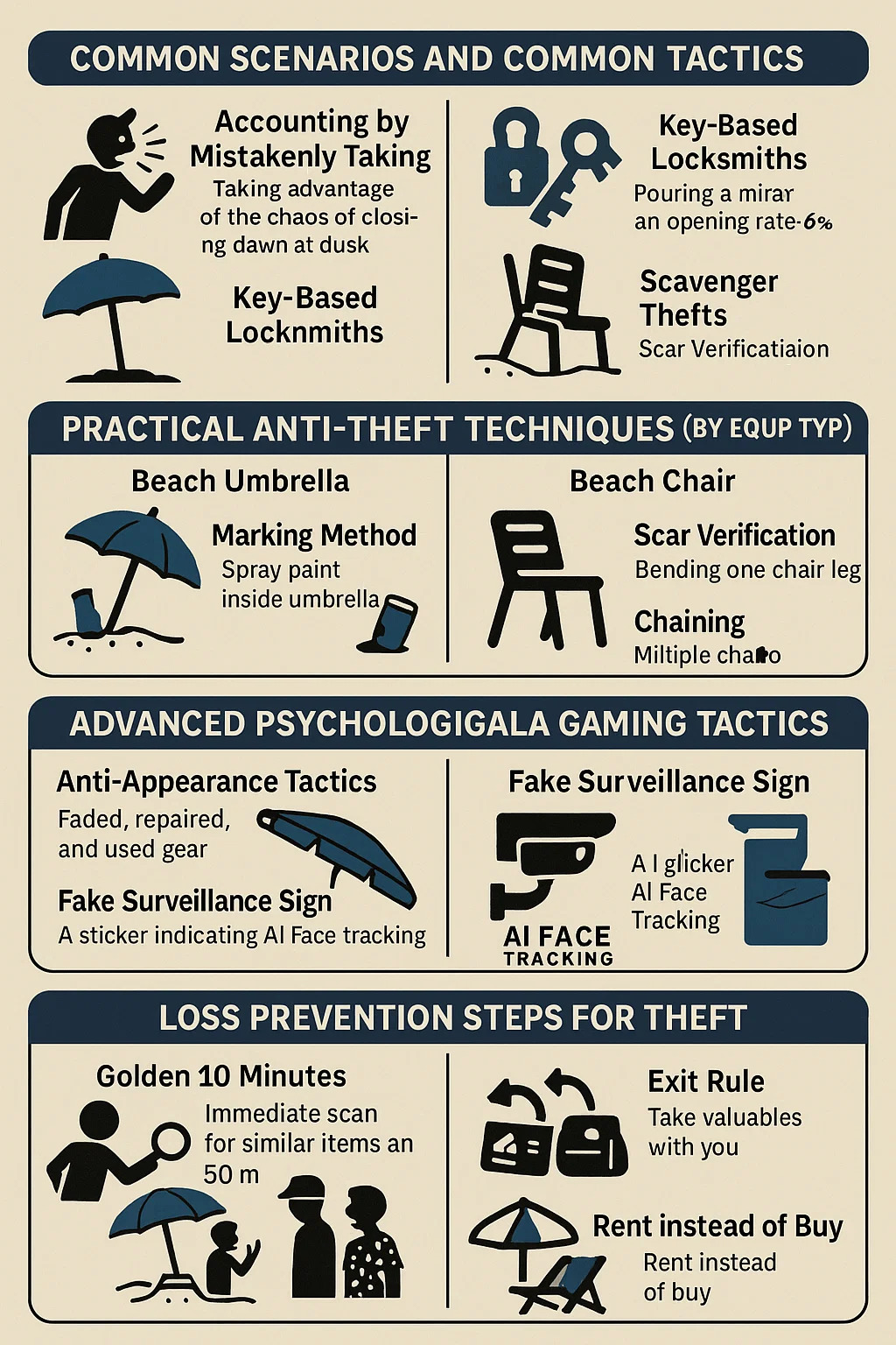 ใช่แล้ว การขโมยของ ร่มชายหาด และเก้าอี้เป็นปัญหาที่พบบ่อยบริเวณริมชายหาด ด้านล่างนี้เป็นกลยุทธ์การตอบสนองแบบแบ่งระดับตามประสบการณ์ของผู้จัดการชายหาดและผู้มาเยือนเป็นประจำ: