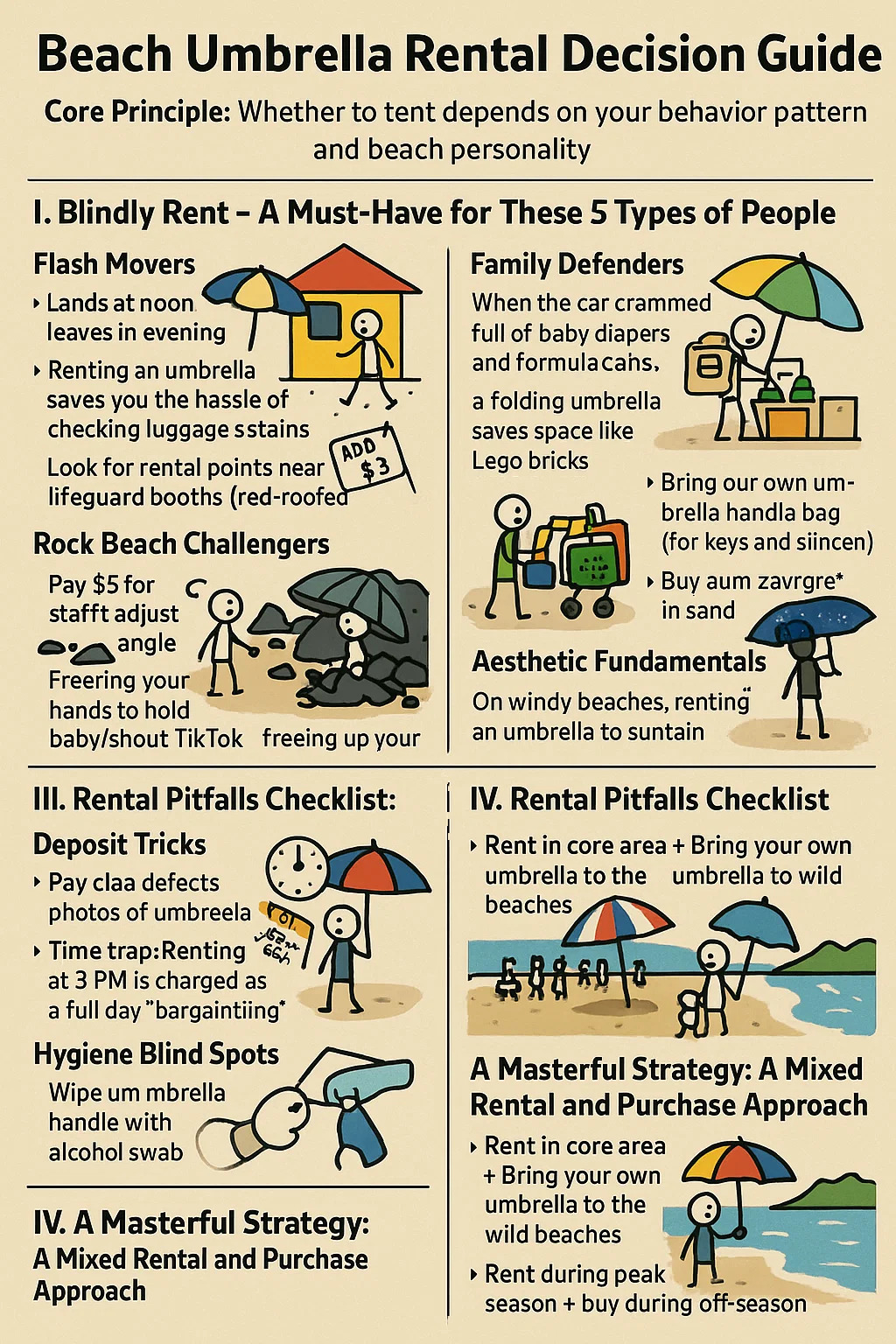 Rock Beach Challengers: ไม่สามารถเอาร่มไปวางบนหาดหินภูเขาไฟได้ → เช่าร่มแบบสั่งทำพิเศษที่มีสลักเกลียวเสริม: สำหรับผู้ที่ขี้เกียจมาก: จ่ายเงิน 5 ดอลลาร์ให้พนักงานปรับมุมแล้วติดร่ม ปล่อยมือของคุณเพื่ออุ้มลูกน้อย/ถ่ายวิดีโอ TikTok สำหรับผู้ใช้ที่ชอบผจญภัย: เช่าร่มพร้อมม่านด้านข้างเพื่อใช้เป็นห้องเปลี่ยนเสื้อผ้าชั่วคราว หรือเช่าร่มเรืองแสงเพื่อถ่ายภาพชายหาดไซเบอร์พังค์ยามค่ำคืน