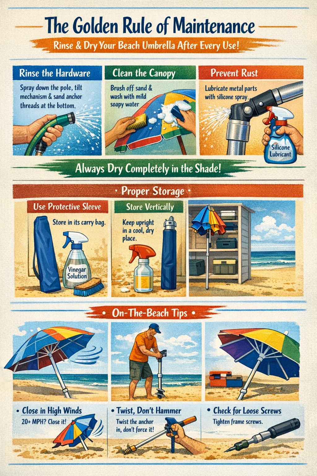 ขั้นตอนที่สำคัญที่สุดในการดูแลรักษาก ร่มชายหาด คือการ ล้างออกด้วยน้ำจืดแล้วเช็ดให้แห้งสนิท หลังการใช้งานทุกครั้ง น้ำเค็มและทรายทำหน้าที่เป็นสารกัดกร่อนที่ทำให้ผ้าและข้อต่อโลหะเกิดสนิม ด้วยการใช้เวลาห้านาทีในการล้างอุปกรณ์ของคุณ คุณสามารถยืดอายุการใช้งานจากฤดูกาลเดียวไปเป็นตลอดได้ ห้าปีแห่งการใช้งานที่เชื่อถือได้ .