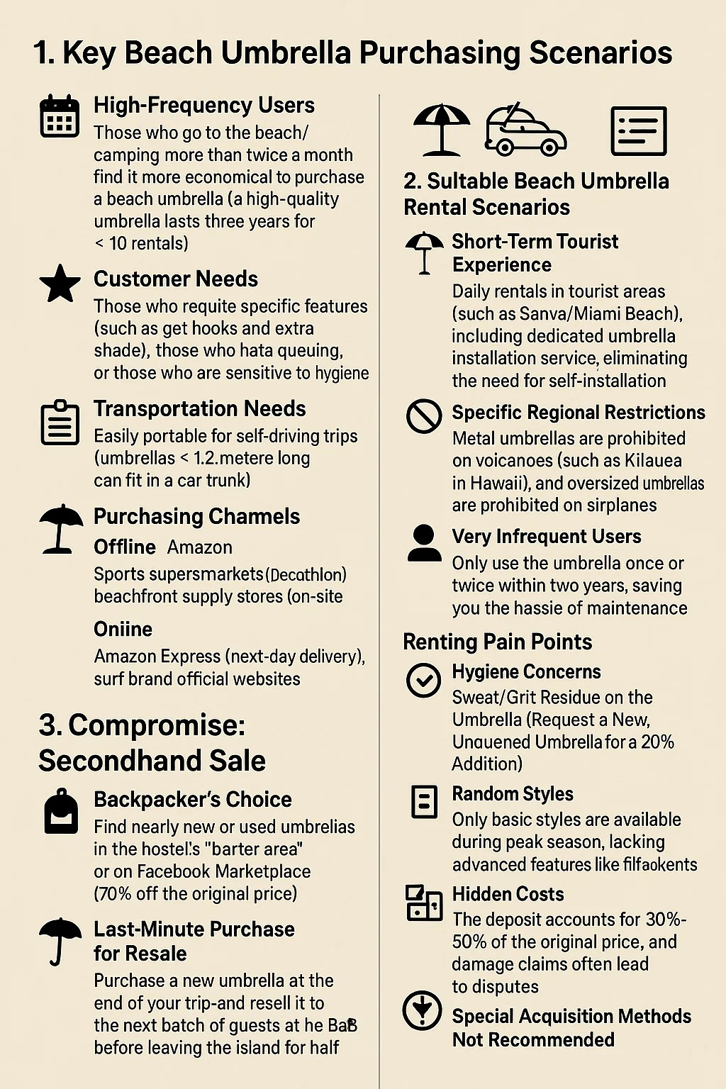 ผู้ใช้ที่มีความถี่สูง: ผู้ที่ไปที่ชายหาด/ตั้งแคมป์มากกว่าสองครั้งต่อเดือนพบว่าประหยัดกว่าที่จะซื้อร่มชายหาด (ร่มคุณภาพสูงเป็นเวลาสามปีสำหรับการเช่า 10 ครั้ง)
