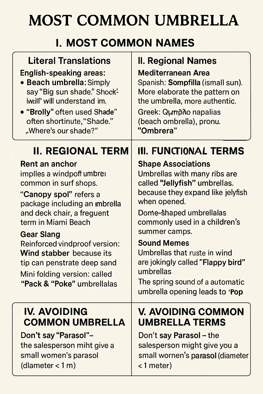อย่าพูดว่า "ร่มกันแดด" พนักงานขายอาจให้ร่มกันแดดสำหรับผู้หญิงตัวเล็ก (เส้นผ่านศูนย์กลาง < 1 เมตร) แก่คุณ