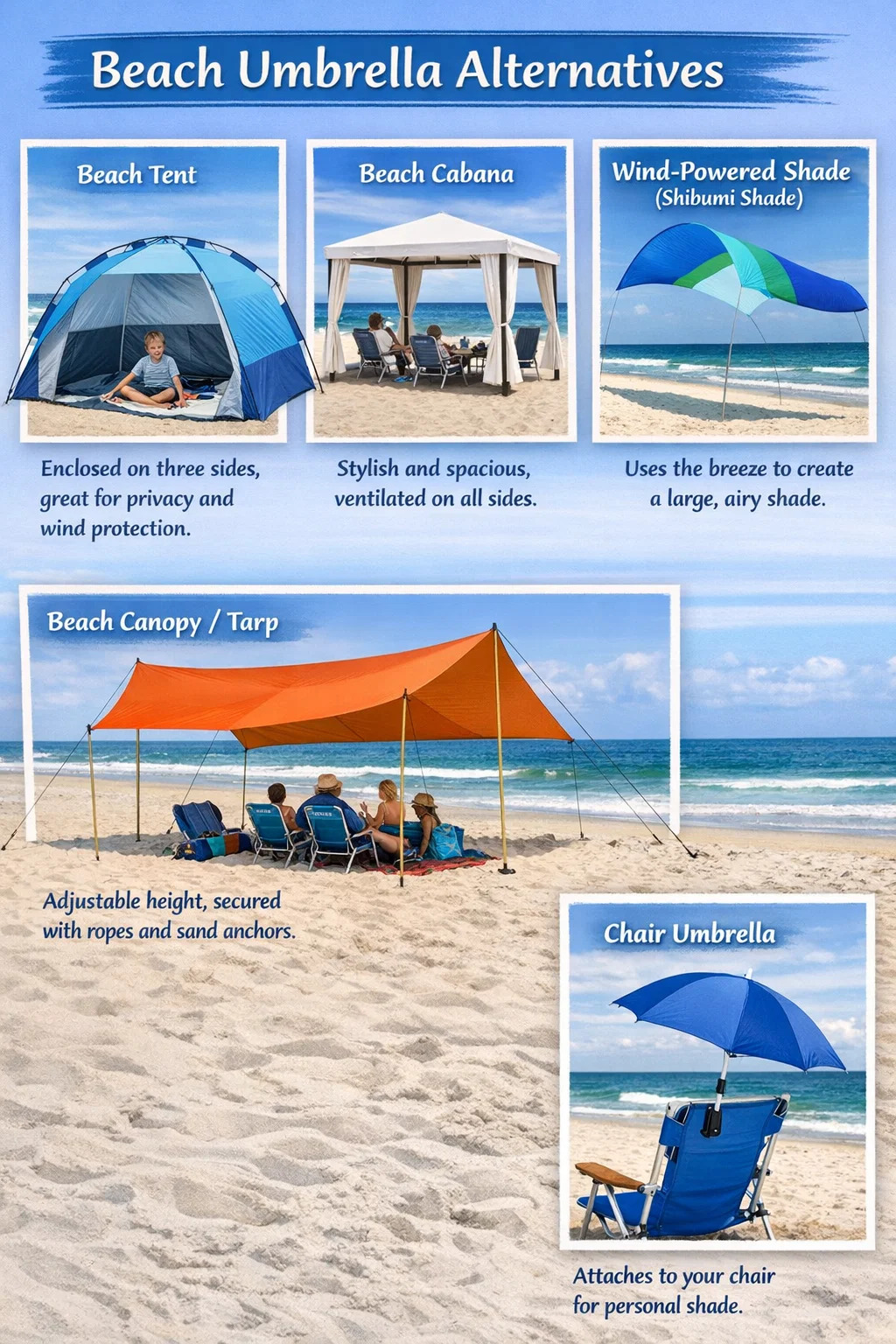 หากคุณพบว่าการถือหรือตั้งร่มชายหาดลำบากเกินไป หรือกังวลว่าจะถูกลมพัดปลิวไป ก็มีทางเลือกอื่นๆ ที่มั่นคงกว่ามากมายที่มีพื้นที่ร่มเงาขนาดใหญ่ในท้องตลาด