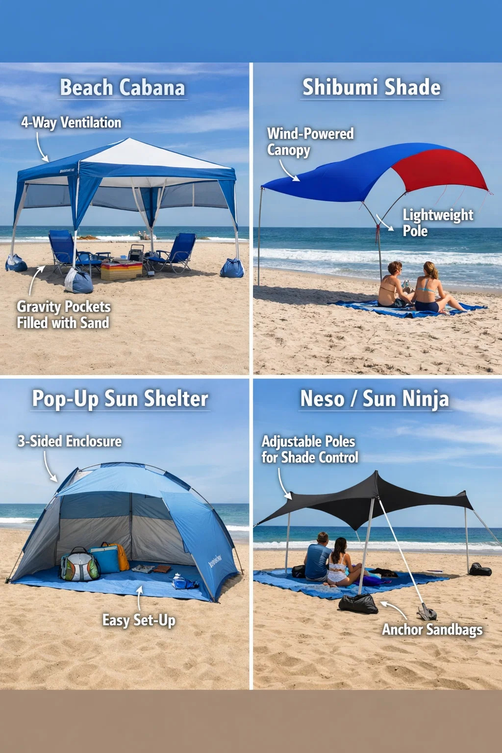 ในขณะที่ ร่มชายหาด เป็นแบบคลาสสิก หากคุณกำลังมองหาประสบการณ์การป้องกันแสงแดดที่มั่นคง กว้างขวาง หรือทันสมัยกว่า ตัวเลือกต่อไปนี้ให้การปกป้องที่เหนือกว่าในหลายๆ ด้าน: