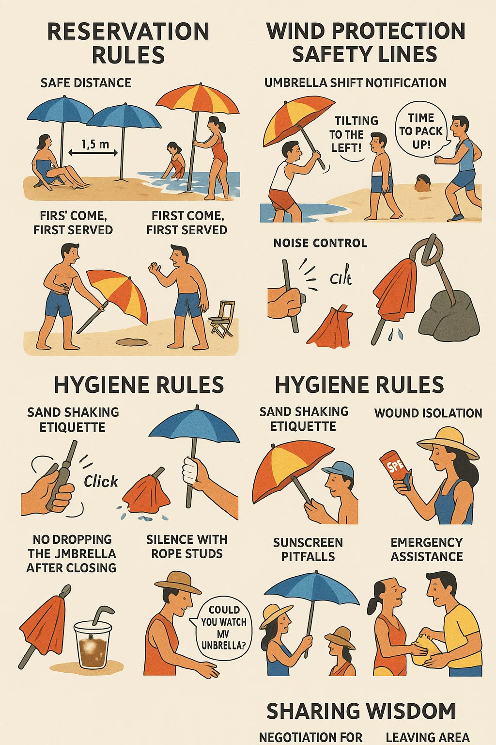 Sand Shaking Etiquette: Before closing your umbrella, shake it three times in a secluded area to avoid sand getting into other people's sandwiches.