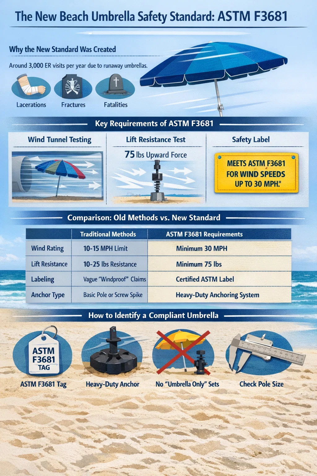ที่ มาตรฐานร่มชายหาดใหม่คือ ASTM F3681-24 (อัปเดตเป็น F3681-25) ซึ่งกำหนดข้อกำหนดด้านประสิทธิภาพอย่างเป็นทางการเป็นครั้งแรกในด้านความต้านทานลมและความปลอดภัยในการยึดสมอ ภายใต้แนวทางใหม่นี้มีมาตรฐาน ร่มชายหาด ด้วยเส้นผ่านศูนย์กลาง 7.5 ฟุต จะต้องสามารถทนได้ ความเร็วลมสูงสุด 30 ไมล์ต่อชั่วโมง (MPH) โดยไม่ต้องลอยไปในอากาศ นอกจากนี้ระบบพุกจะต้องจัดให้มีอย่างน้อย ความต้านทาน 75 ปอนด์ ต้านแรงยกขึ้นเพื่อให้แน่ใจว่าจะปักแน่นอยู่ในทราย