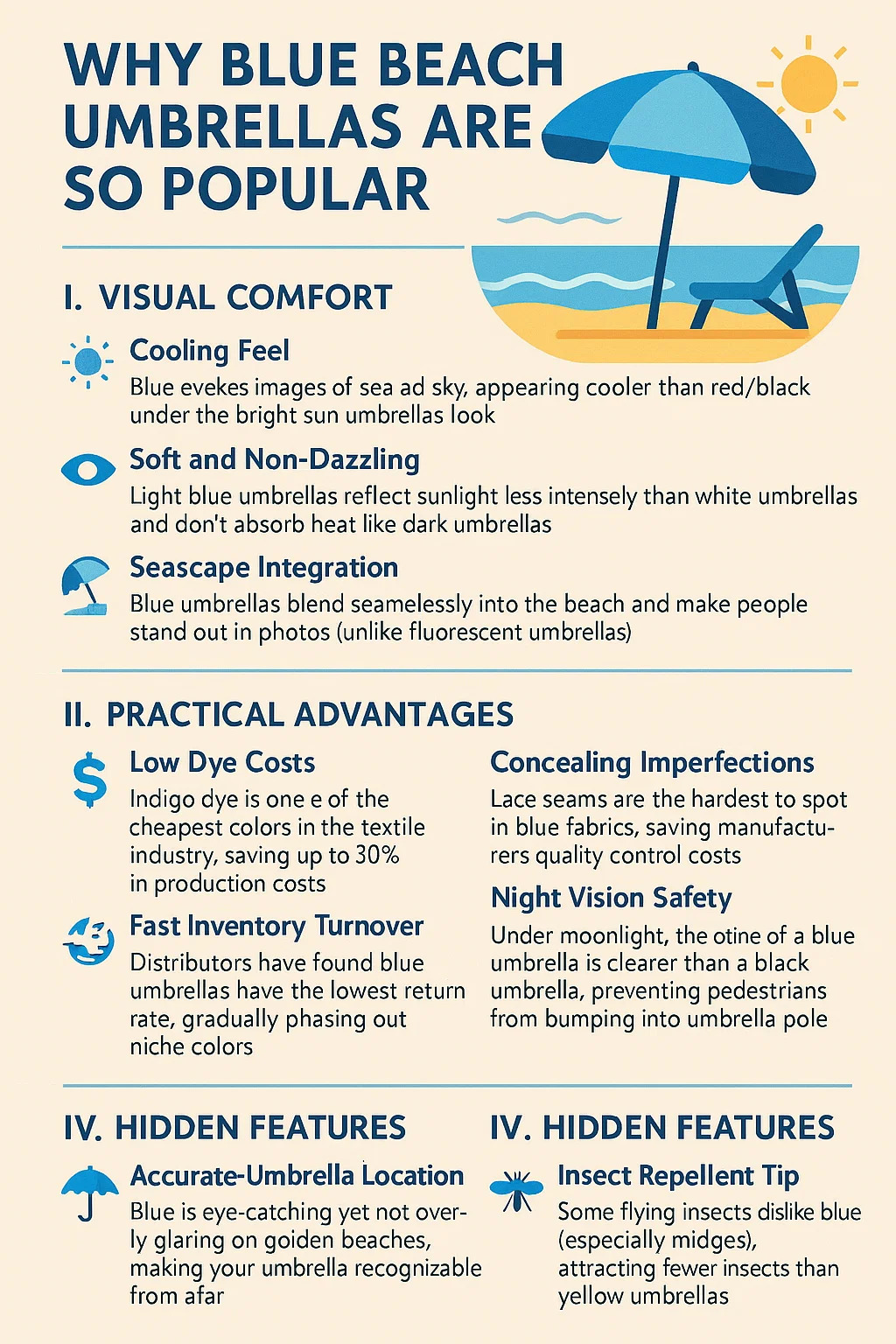 * **Seascape Integration:** Blue umbrellas blend seamlessly into the beach and make people stand out in photos (unlike fluorescent umbrellas).